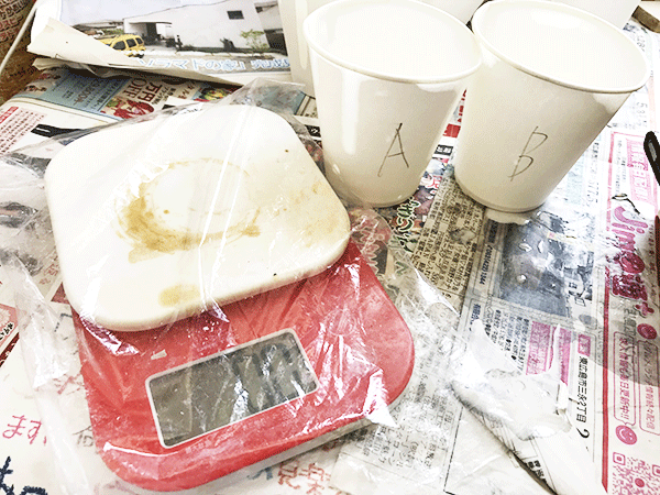 ★必ずスケールはデジタルかつ0.1gのものを使用して下さい。A液、B液の量が違っていると硬化不良の原因になります。
