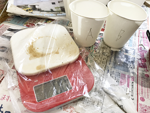 ★0.1g単位のデジタルスケール、紙コップ、ベビーパウダー